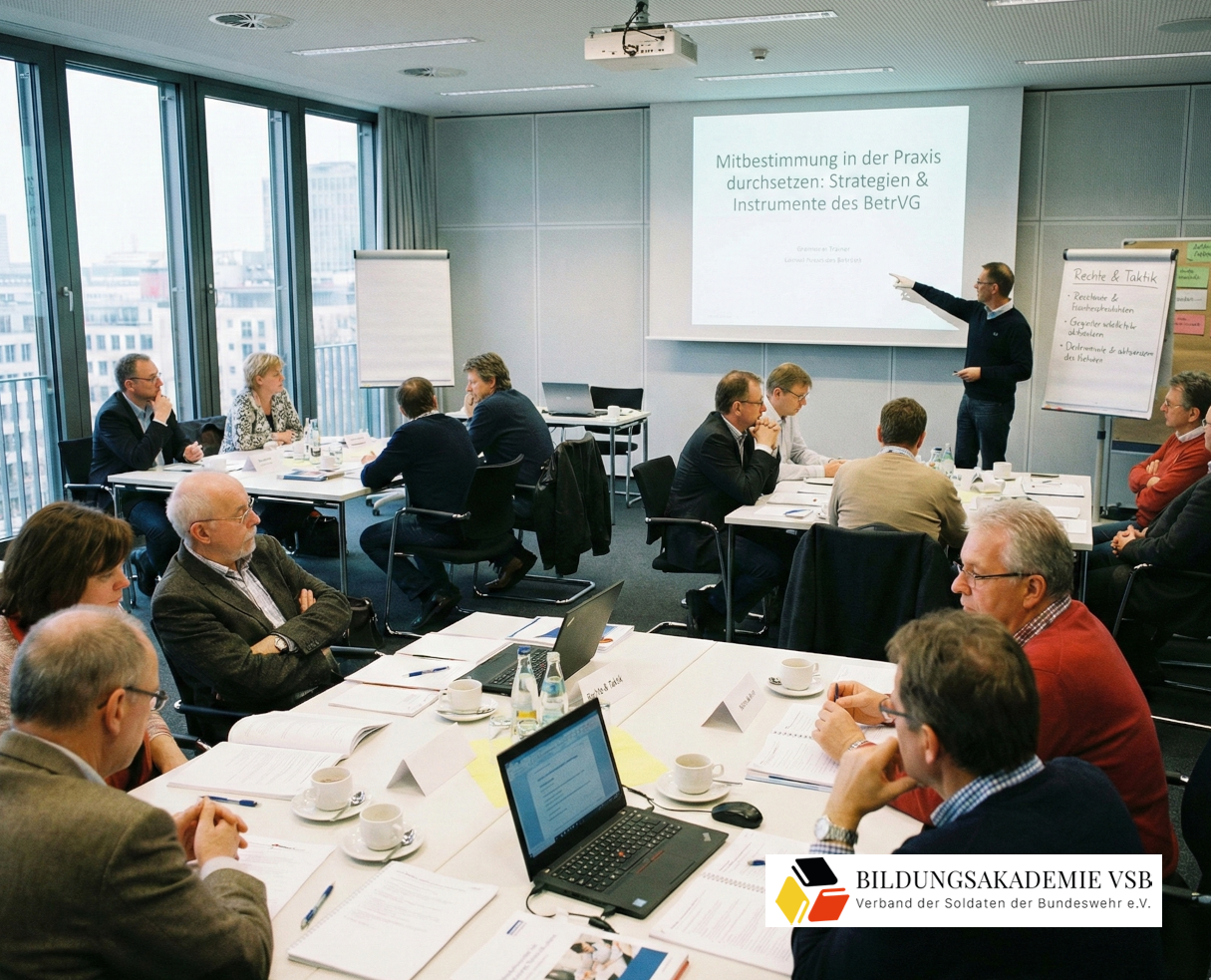 Schulungen bei der BundeswehrIhr Bildungspartner für die Bundeswehr – Kompetenz für Zivil & Militär Die Bildungsakademie VSB bietet maßgeschneiderte Schulungen für alle Ebenen der Bundeswehr. Wir navigieren Sie sicher durch den Paragrafen-Dschungel von BPersVG und SBG, stärken Ihre Rolle als Gleichstellungsbeauftragte und machen Wahlvorstände fit für die rechtssichere Durchführung. Ergänzt durch aktuelle Seminare zur Politischen Bildung, bieten wir Ihnen das Rüstzeug für eine starke Amtsführung.
